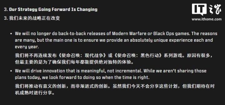 IT之家注意到,动视在声明中强调:“我们将推动具有实质意义的创新,而非仅限于渐进式改进。”尽管公司目前尚未披露具体计划,但表示“将在适当时机与玩家分享”。公告还指出:“《使命召唤》的未来前景十分强劲,凭借我们开发团队深厚的实力与人才储备,我们相信最好的日子还在前方。”此外,动视称该系列即将迈入“全新纪元”,不仅将精准满足玩家期待,还将带来一些推动整个系列乃至射击游戏类型向前发展的惊喜。